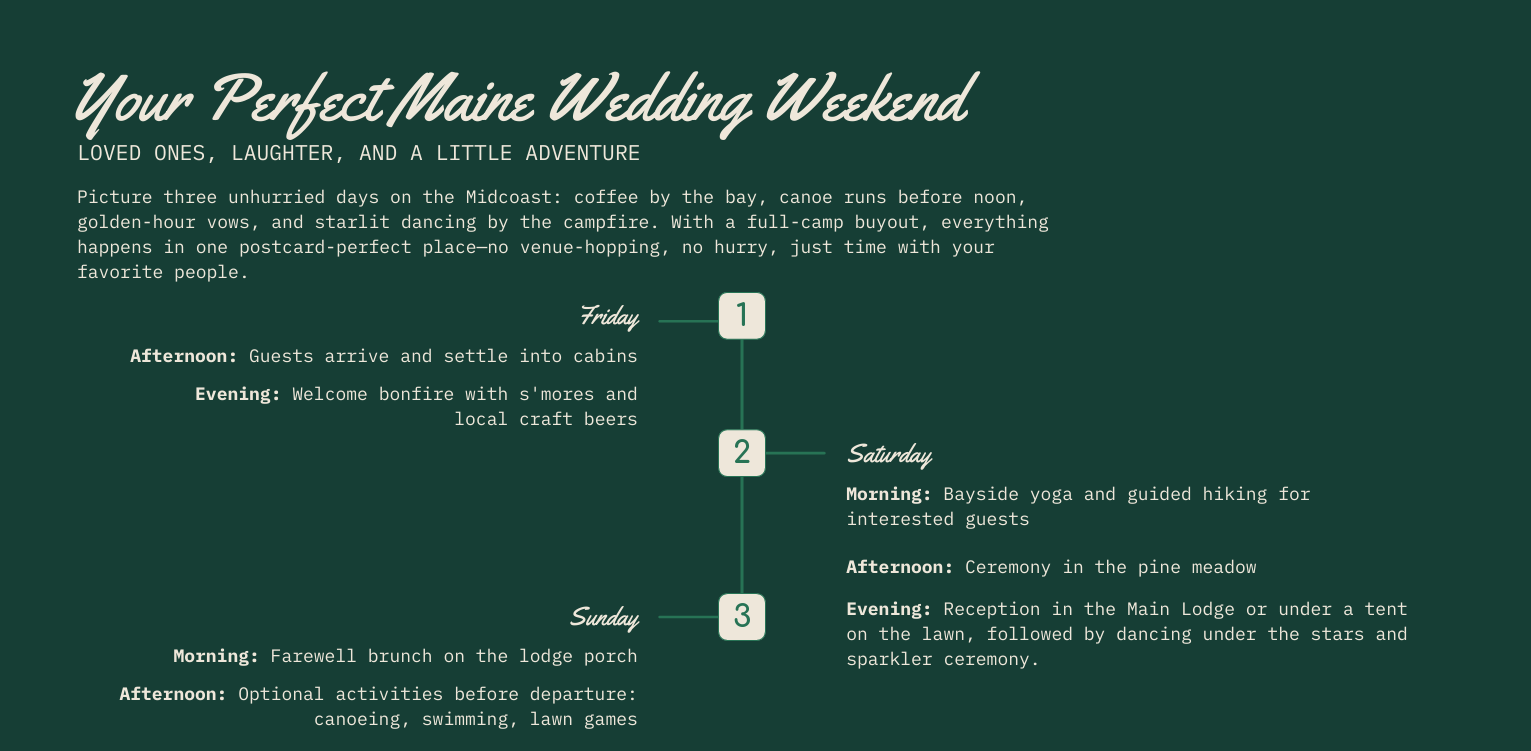Your wedding isn't a six-hour ceremony crammed into one day. It's an entire weekend by Penobscot Bay. Canoes at sunrise. Lawn games between getting ready. Vows under the pines. Dancing under string lights. Sunday coffee around the fire.