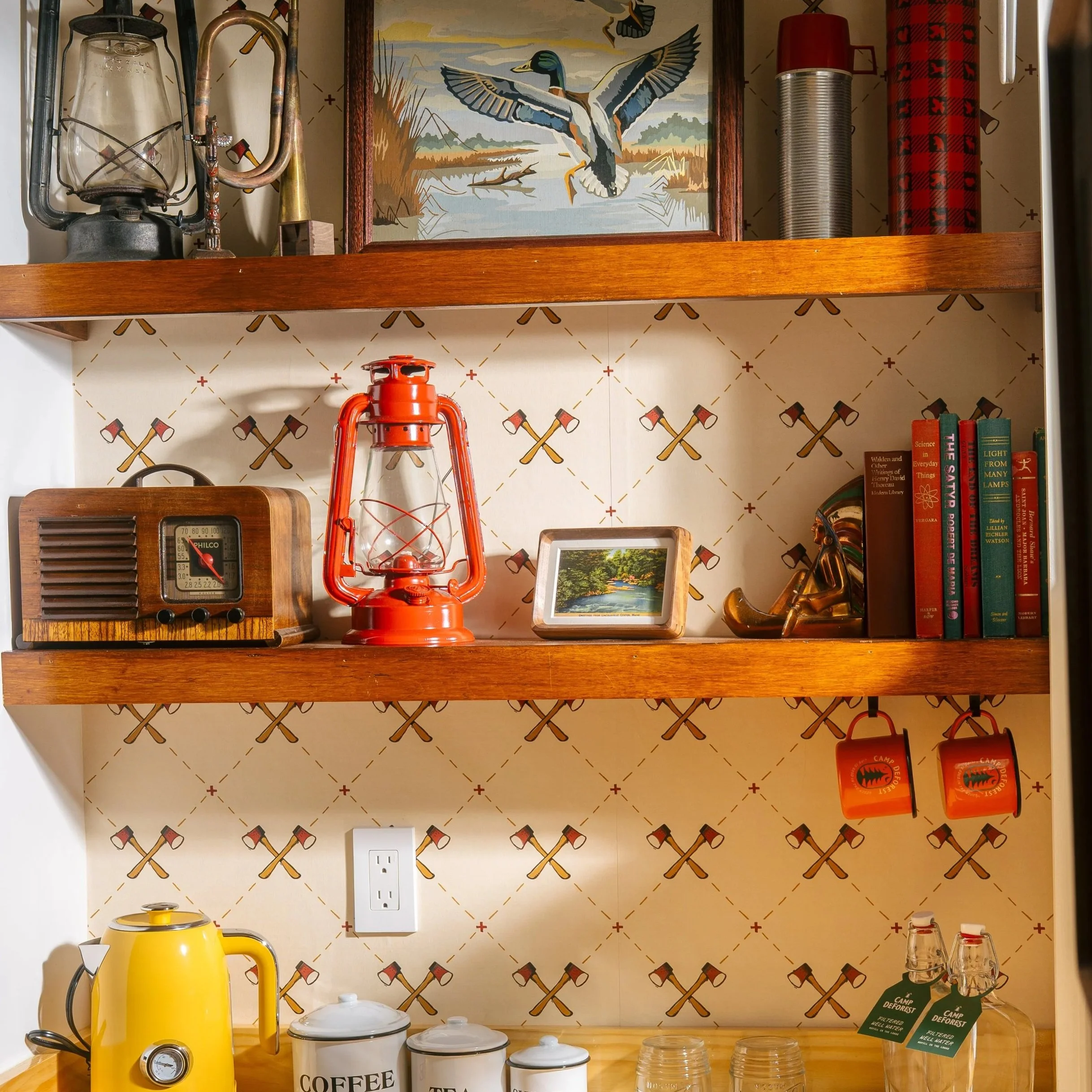 There's a vintage radio on the shelf—the kind with actual dials that your grandparents had. Canvas duffel bags hang on hooks. The color palette is pure 1959: forest green, cream, that specific shade of orange that shows up in old camp guides.