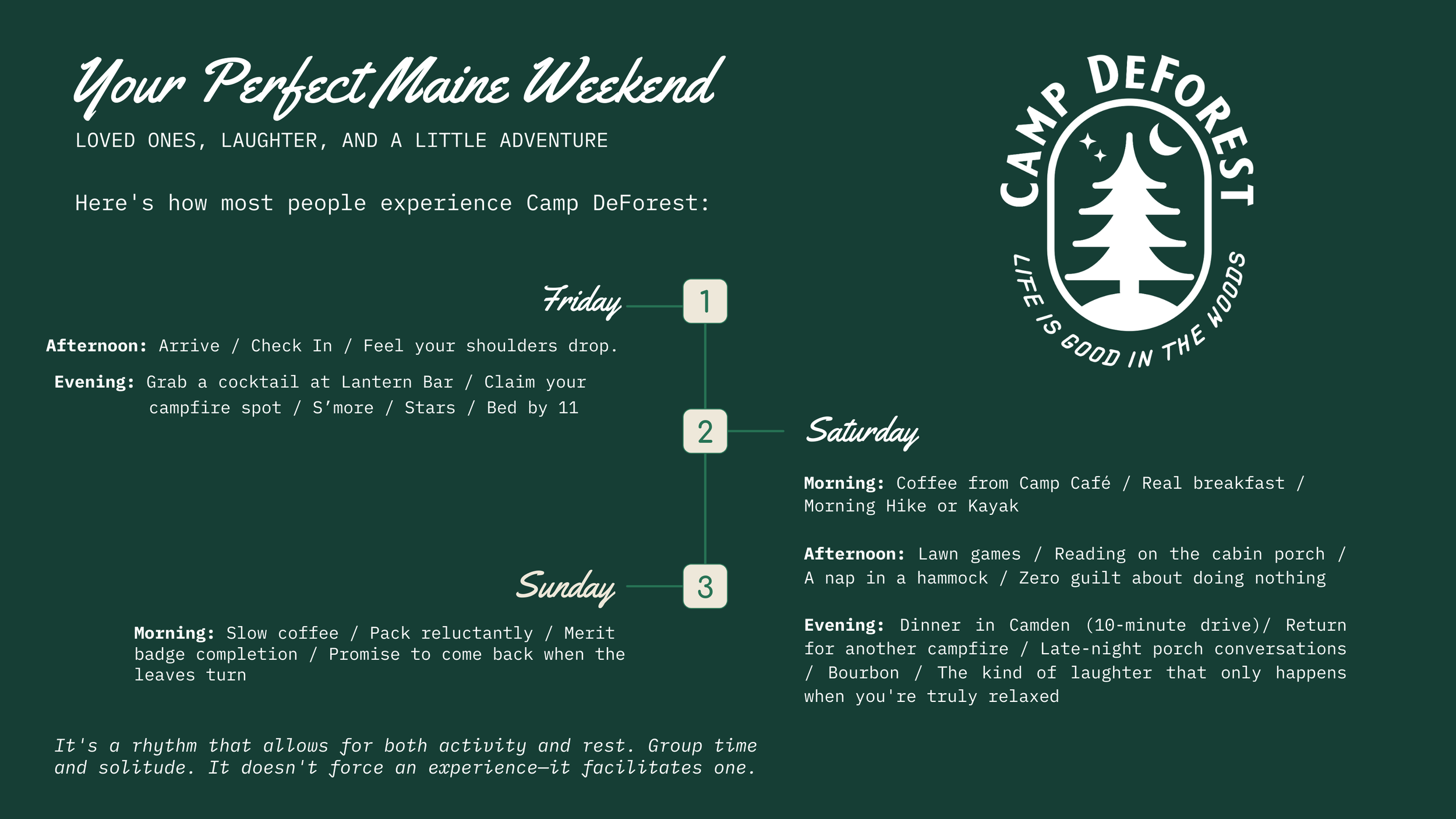 Camp DeForest is different because it's not trying to be everything. It's trying to be one thing, exceptionally well: a place where the magic of summer camp meets the comfort of modern life, set against the backdrop of one of America's most beautiful coastlines.
